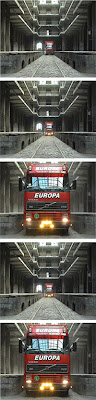 HVC: In 2001 maakte je een toffe video met een geluidsinstallatie. Je zette twee video-installaties in twee tegenovergestelde richtingen. Zoals een kat en een hond elkaar teasen, gaan de vrachtwagens vooruit en weer achteruit. De sound die je erbij hoort is bijna even belangrijk als het beeld in dit werk.
